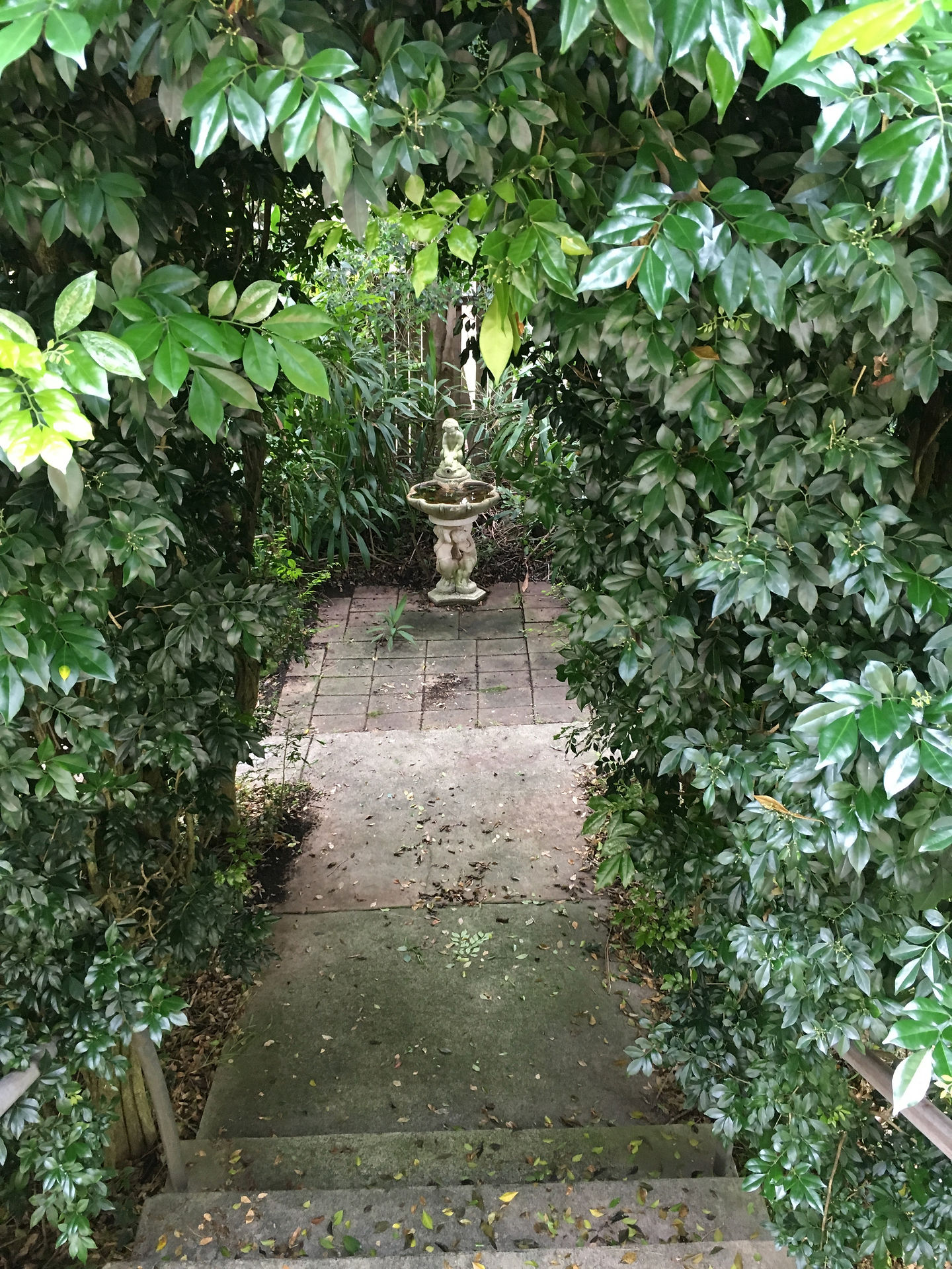 Steven and Liz have worked around the established bones of the garden they found when they arrived: the Chinese elm that provides the veranda with beautiful summer shade, the melaleuca “snow in summer” and crepe myrtle. An enormous old bougainvillea down in the corner, a grand strelitzia, some of which was moved into the driveway, and the Cecile Brunner rose at the garage were also here when Steven and Liz arrived, and still have their places in the present design.